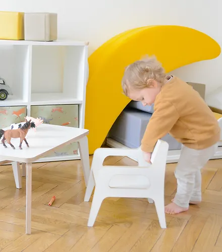 Veidojam pēc iespējas viengabalainākas formas, lai mazinātu izjaukšanas risku un garantētu izturību ilgstošai lietošanai. Turklāt mēs izvairāmies no sīkām detaļām un stiprinājumiem, nodrošinot, ka mēbeles ir drošas un izturīgas mazuļiem.